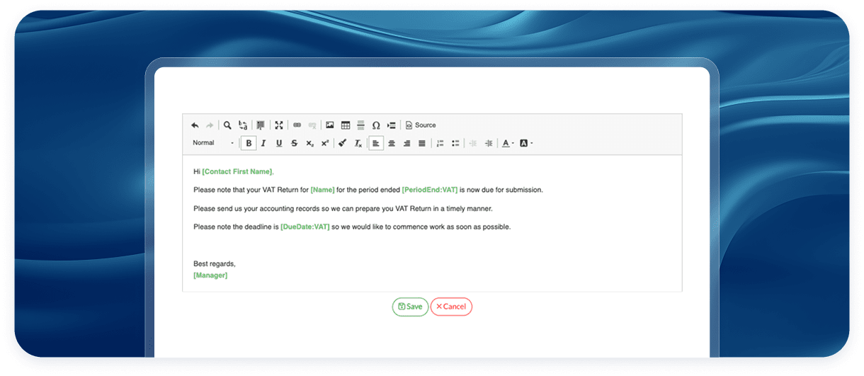 Absolutely! Placeholders like client name, service details, deadlines, and more can be added to personalise every email.