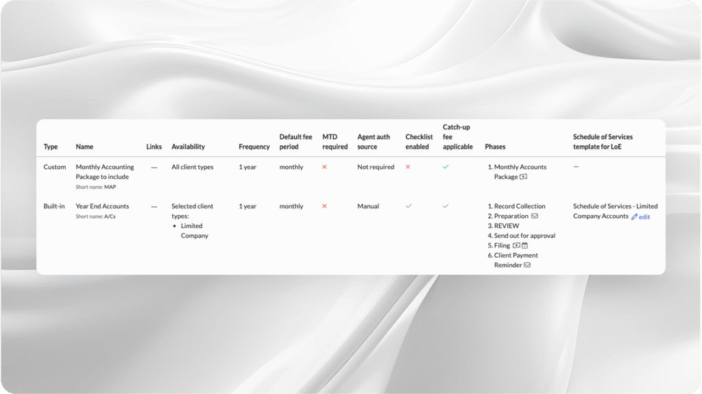You can create any services your practice needs, such as New Client Onboarding, AML Checks, Health Checks, or Annual AML Assessments—tailored to your processes.