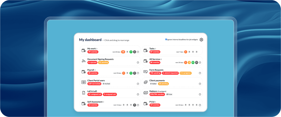 Widgets include key data like outstanding tasks, service deadlines, or client updates. You can also add countdown timers and notepads to stay organised.