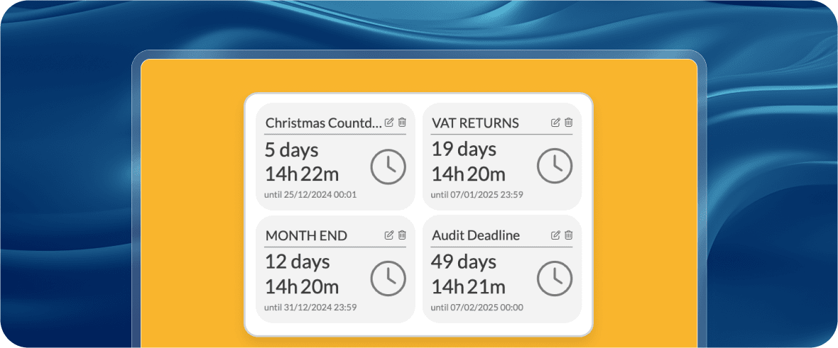 Use countdown timers to keep critical dates in view. Whether it’s a client deadline, VAT return, or follow-up call, timers help you stay on track.