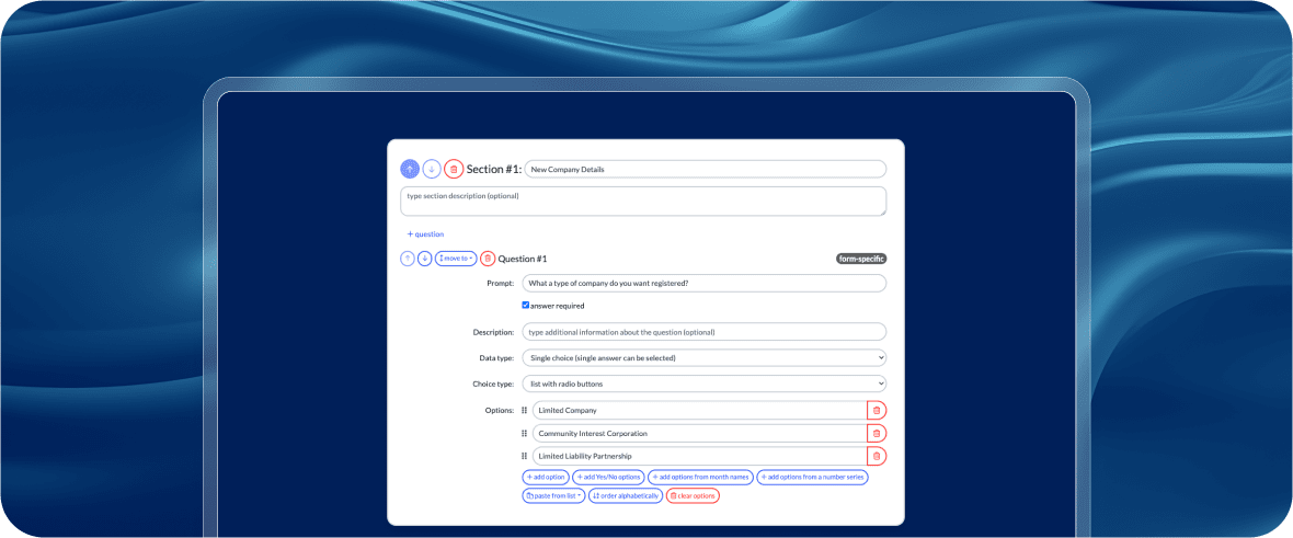 From onboarding details to compliance checks, Engager.app allows you to create forms that suit your exact requirements. Collect everything from built-in fields like “Company Number” to custom data points that drive your workflows.