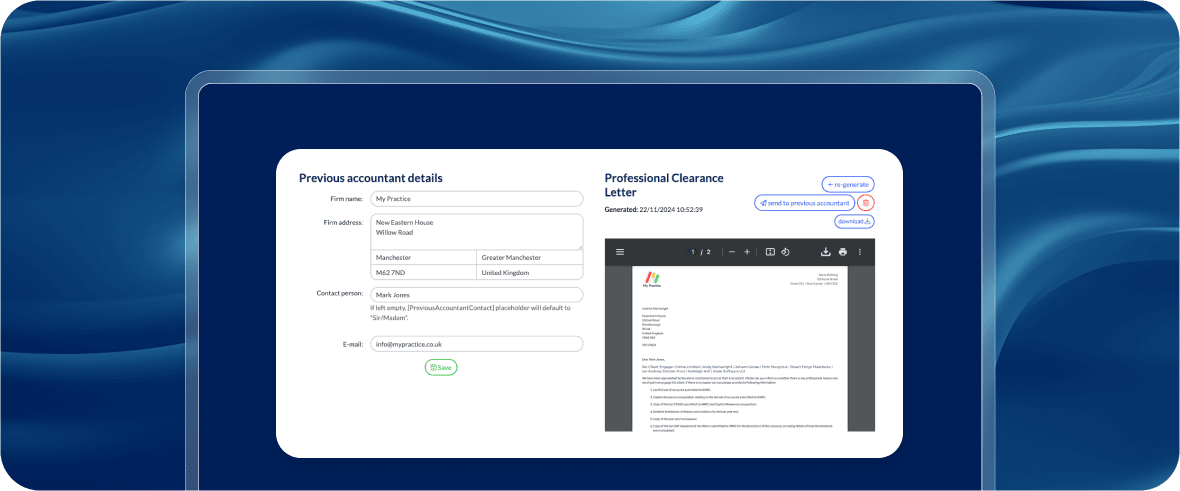 Engager.app automatically generates clearance letters based on client services, removing the need for manual effort and saving you hours of work.