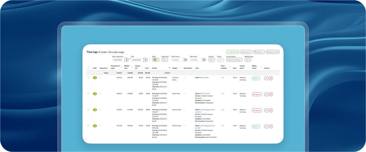 By tracking time spent versus budgets, you can identify where resources are being overused or underutilised. Use this data to improve workflows and ensure services remain profitable.